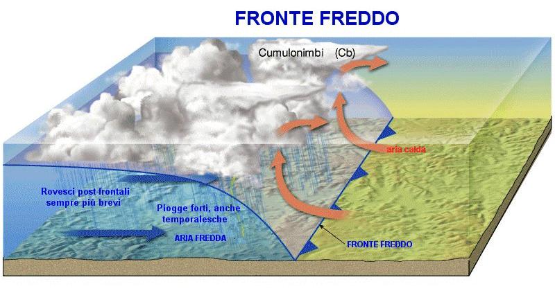 Fronte freddo: è un fronte lungo il quale una massa d’aria fredda avanza verso una massa d’aria più calda che, ed essendo più pesante, s’incunea al di sotto di essa. L’aria più calda, presente nelle immediate vicinanze del fronte freddo, viene sollevata in alto, spesso con grande violenza, dando origine a nubi di grande sviluppo verticale (cumuli e cumulonembi), per lo più accompagnate da forti precipitazioni, da temporali con isolati colpi di vento e, talvolta, da grandine.