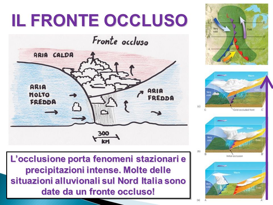 Fronte occluso od occlusione: generalmente un fronte caldo è seguito da un fronte freddo, che si sposta più rapidamente e quindi finisce per raggiungerlo. L’aria calda, che prima si trovava tra questi due fronti, viene allora tutta sollevata sopra il suolo, si genera quindi un nuovo tipo di fronte, chiamato fronte occluso od occlusione, in corrispondenza del quale si ha la presenza di tre masse d’aria, con un fronte al suolo ed un fronte in quota, l’occlusione al suolo può avere carattere di fronte caldo (occlusione a carattere caldo), oppure di fronte freddo (occlusione a carattere freddo). Spesso le occlusioni, specie durante lo stato iniziale, danno luogo a grandi formazioni nuvolose, con violente precipitazioni anche temporalesche ed isolati colpi di vento.